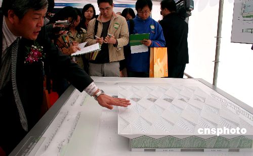 世博集團董事長戴柳(左)在首次亮相的“世博會主題館模型”前介紹說,這一展館的建設成本將控制在十三億人民幣左右。