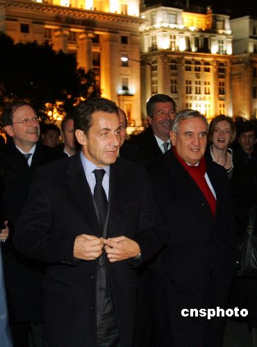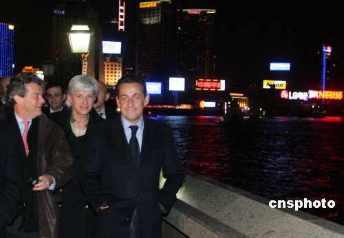 11月27日晚,正在中國訪問的法國總統尼古拉·薩科齊在上海饒有興致地漫步黃浦江畔,欣賞迷人夜景。中新社發 湯彥俊 攝