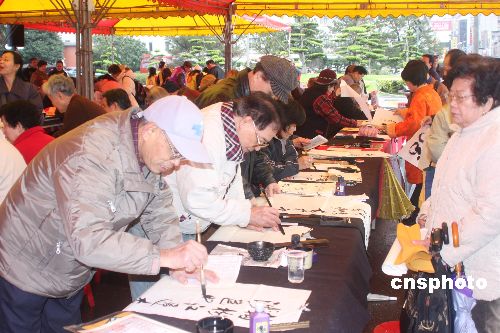 臺(tái)灣一年一度的新年開筆大會(huì),2月3日在臺(tái)灣領(lǐng)導(dǎo)人辦公室前廣場(chǎng)舉行。報(bào)名參加書法揮毫者達(dá)三千多人。中新社發(fā) 耿軍 攝