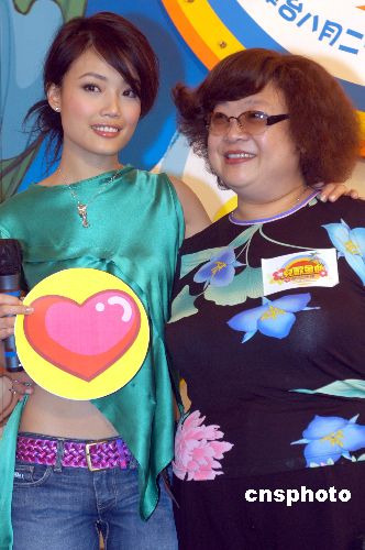 歌星容祖兒2005年7月21日在香港出席無線電視《兒歌金曲頒獎(jiǎng)典禮2005》記者會(huì),并與擔(dān)任頒獎(jiǎng)典禮大會(huì)司儀的沈殿霞會(huì)上合影。中新社發(fā) 鄧慶樂 攝