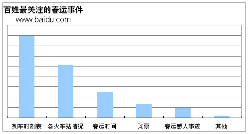 春節期間,網民最關心的無疑是春運問題,受百年難遇的南方雪災影響,今年春運的形勢尤為嚴峻,好人好事也不斷涌現。因此,網民今年不僅關注春運時間、列車時刻表、購票等信息,而且尤為關注春運中的感人事跡。在關于春運的檢索中,出現了“春運好人好事”、“春運感動瞬間”、“雪災先進事跡”等新鮮詞,占春運相關檢索量的5.2%。