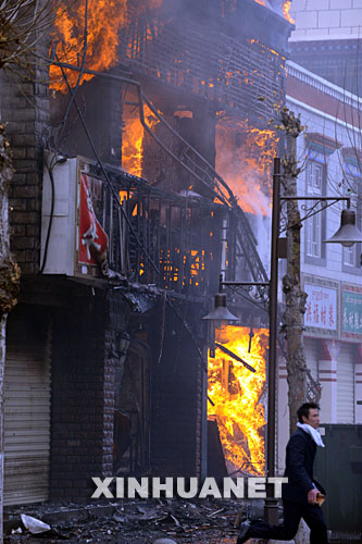 3月14日,拉薩市朵森格路上的商店正在燃燒。 新華社記者 格桑達瓦 攝