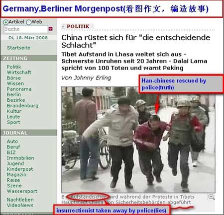 類似的“張冠李戴”還有不少。德國《柏林晨報》網(wǎng)站18日將一張西藏公安武警解救被襲漢族人的照片硬說成是在抓捕藏人;美國福克斯電視臺網(wǎng)站刊登圖片稱,中國軍人將藏人抗議者拉上卡車,可圖片中明明是印度警察。德國NTV電視臺也在報道中將尼泊爾警察抓捕藏人抗議者說成是“發(fā)生在西藏的新事件”。