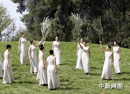 希臘當地時間3月24日,北京二00八年奧運會圣火采集儀式在古奧林匹亞競技場舉行,最高女祭司順利采集到火種。女祭司手擎橄欖枝不斷變幻隊形,在山坡上舞蹈。中新社記者 王歡