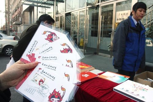 3月24日,北京百萬(wàn)莊郵局工作人員正在發(fā)售《第29屆奧林匹克運(yùn)動(dòng)會(huì)--火炬接力》紀(jì)念郵品。當(dāng)日,2008年首套奧運(yùn)郵票《第29屆奧林匹克運(yùn)動(dòng)會(huì)--火炬接力》正式發(fā)行。中新社發(fā) 追影 攝