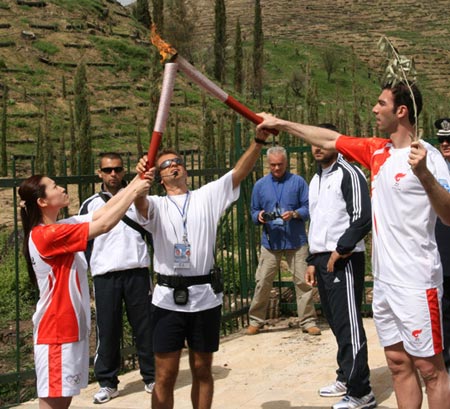 希臘運動員將火炬?zhèn)鬟f給第一位中國火炬手羅雪娟。中希時報 汪鵬攝