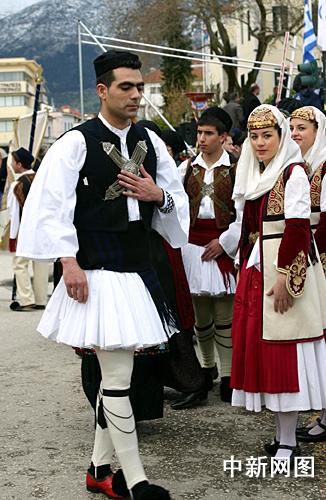3月25日,北京2008年奧運圣火希臘傳遞第二天,慶典儀式在終點約阿尼納舉行。圖為身著希臘民族傳統服裝的舞蹈演員。中新社記者 王歡