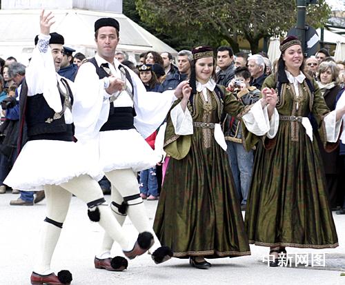 3月25日,北京2008年奧運圣火希臘傳遞第二天,慶典儀式在終點約阿尼納舉行。舞蹈演員們跳起民族舞蹈迎接北京奧運圣火。據悉,這種希臘非常著名的傳統舞蹈,只有在重大節日或儀式慶典的時候才會表演。中新社記者 王歡