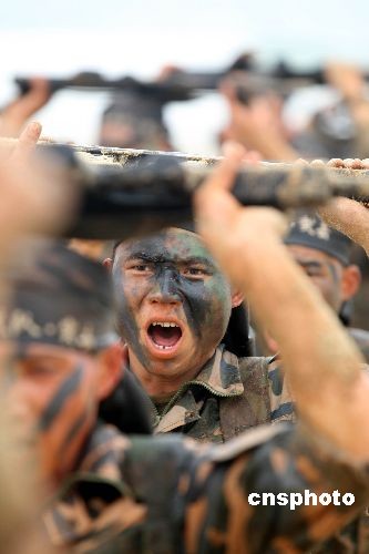 圖為中國陸戰隊員進行沙灘體能訓練。中新社發 李唐 攝