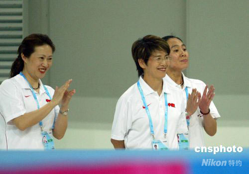 圖為中國花游日籍主教練井村雅代(中)及教練組成員在場邊為隊員的優異表現喝彩。中新社發 富田 攝