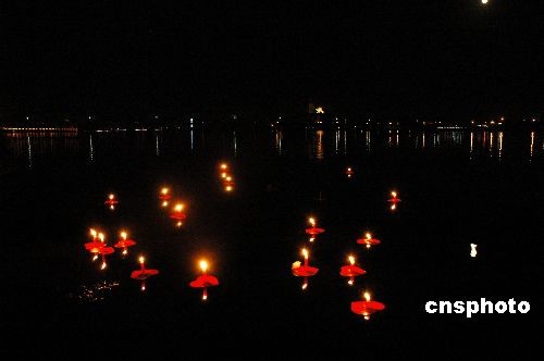5月19日晚,河南省南陽市臥龍區市民來到白河邊放飄自制的河燈,為汶川地震災民祈福。這些河燈均為心型,上面放上點燃的紅蠟燭,寓意一水相連,山脈相通,血脈相親。