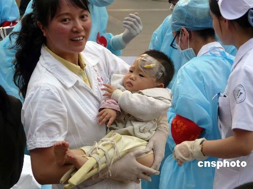 5月19日下午五點半多,四川汶川地震災區的一批重傷員抵達重慶,重醫附一院的醫生護士象解放軍野戰醫院搶救傷員一樣投入搶救,猶如前方的戰場。