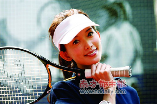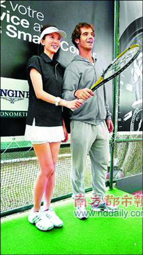 當天,主辦單位安排現年19歲、目前法國排名第一的網球選手RichardGasquet教林志玲發球,“師徒”兩人剛見面,沒打過網球的林志玲就羞紅了臉。師傅教她握拍、開球,善打羽毛球的林志玲以羽毛球動作開球,“花拳繡腿”地揮拍接球,接連幾球都將球砸向攝影師,她俏皮地頻吐舌頭道歉。(祁玲)