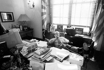 他的辦公桌面則活脫脫一間倉庫:一個貝利·高華德的搖頭公仔,一個泰迪·羅斯福的填充人偶,一個盛滿羽毛的杯子,一個帽子上寫著“軍隊”二字的綠色巫婆填充玩偶,一條刻著在伊拉克戰死的某士兵名字的手鐲,以及數不清的碎紙、石頭、硬幣和曲別針。粘在桌子一角的簽語餅的小紙條很容易勾起人們的回憶,上面寫著:“相比于金錢和成功,原則對你更重要。