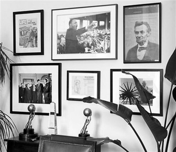 辦公室里有一面“英雄墻”,貼的都是他欽佩的歷史人物照片,其中有亞伯拉罕·林肯、甘地和他的紡車、馬丁·路德·金和約翰·F·肯尼迪。墻上還掛了一份加了外框的1963年華盛頓游行時日程安排的原始文件,金正是在那次游行過程中發表了《我有一個夢想》的演講。