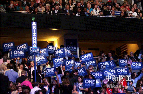 Jim Leach作為共和黨員也上臺為奧巴馬發表演講,臺下觀眾紛紛拿出“同一個國家”的標語表示支持。馬婧 攝
