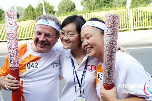 9月4日,殘奧會(huì)火炬到達(dá)北京,將在北京的“一壇兩園”展開(kāi)最后一天傳遞行程。據(jù)北京市體育局副局長(zhǎng)孫學(xué)才介紹,北京地區(qū)的240名火炬手既有工作在基層一線的普通勞動(dòng)者,又有體壇名將、文藝工作者。其中,殘疾人士共70名,占火炬手總數(shù)的近30%。中新社發(fā) 王昊 攝