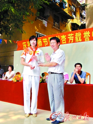 說起當年自己的調皮事,謝杏芳笑了,“趁著教師節回來,正好給母校的恩師們送上祝福,祝愿他們節日快樂,工作順利,為祖國為廣州培養更多的人才。”謝杏芳的父母也被邀請來到現場,濱江中一小的不少退休老教師特地回到學?纯催@位世界冠軍,他們紛紛拉著謝杏芳的手:“阿芳,你還記得我嗎?”