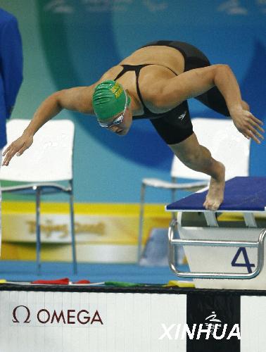 南非著名“獨腿美人魚”納塔莉•杜托伊特同樣在“水立方”成就了自己的金牌夢想。這位“雙奧戰士”在女子100米蝶泳-S9級、女子100米自由泳-S9級、女子200米個人混合泳-SM9級、女子400米自由泳-S9級和女子50米自由泳-S9級中摘得五金,并列北京殘奧會奪金王。