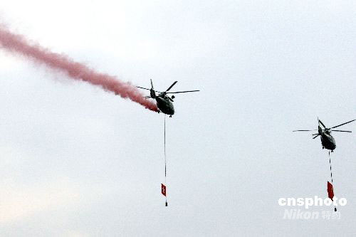 升旗儀式中,直升機懸掛國旗、區旗,噴射彩色煙火掠過金紫荊廣場上空。