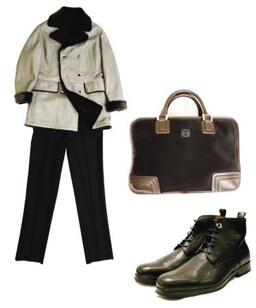 “皮”氣致搭:霧灰色羊毛領一體皮衣+絲絨面料男長衫+男西褲+小牛皮男鞋