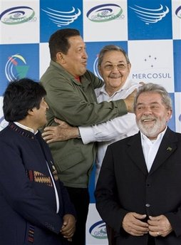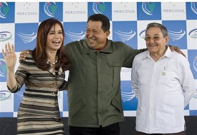 12月16日,在巴西東北部城市紹伊皮海濱,阿根廷總統克里斯蒂娜(左)、委內瑞拉總統查韋斯(中)和古巴國務委員會主席勞爾·卡斯特羅合影。