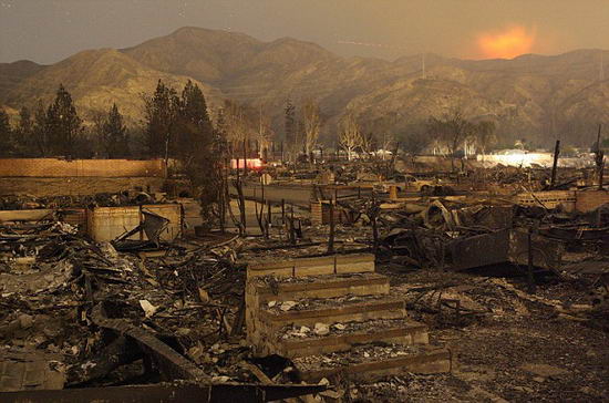 大火是上周四晚上在人口密集的圣費爾南多山谷燃起的,摧毀了數十間房屋,并對關鍵的電力供應線路構成了威脅。大火在風力的幫助下燒過干燥的山谷和山坡,熱風使當地溫度達到創記錄的30度;饎菰跁r速達112公里的強風的幫助下蔓延了2600英畝,迫使1萬名居民撤離,自上周四以來,過火面積已超過20000英畝,發生火情的地區包括洛杉磯北部的山丘、東南部的奧蘭治縣山谷、北部圣巴巴拉縣附近名人聚集的蒙特其托居住區。估計有1000套房屋被燒毀。加州州長施瓦辛格在視察火災造成的損失情況后稱:“對于南加州人來說,過去的幾天非常艱難!