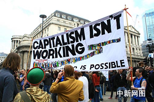 打出標語“資本主義不靈了” 。中新社記者李鵬 攝