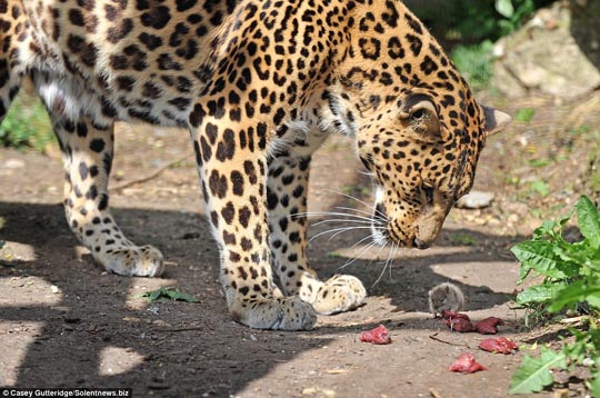英國媒體5日刊出了一組照片,照片中的小老鼠看來只有兩三個月大,在動物園的喂食時間稍過不久,便見它蹦蹦跳跳的溜進了豹子的地盤。來干嘛?呵呵,偷點小點心嘗嘗唄!