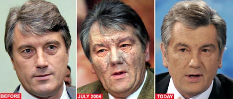 盡管保住了性命,但尤先科的面容卻嚴重變形。他原來外表英俊瀟灑,曾被媒體稱為“烏克蘭最性感的男子”。但中毒后卻變成了一個“面部皺皺巴巴的丑男人”,好像突然之間老了幾十歲。