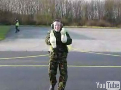 英皇家空軍軍官跑道上邊跳霹靂舞邊指揮飛機(jī)起飛