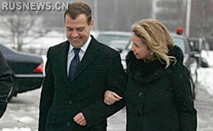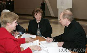 新一屆總統(tǒng)的熱門人選、俄第一副總理梅德韋杰夫偕夫人斯韋特蘭娜則在駐地附近的第二六一四號投票站出現(xiàn)。四十二歲的梅德韋杰夫投票后表示心情不錯:“春天已經(jīng)來了,雖說有點(diǎn)小雨,也是令人愜意的插曲。畢竟季節(jié)已經(jīng)變了。”