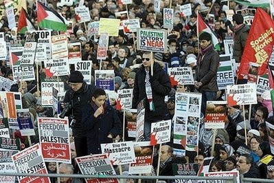 在倫敦,數千人手持巴勒斯坦旗幟,在首相府外抗議,部份示威者又向首相府扔鞋。
