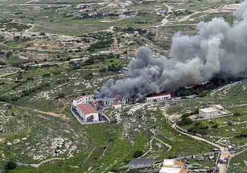 2月18日,在意大利南部蘭佩杜薩島,濃煙從一處移民收容中心升起。據當地警方稱,當天,一些被拘留在此的非法移民試圖逃跑失敗后,便縱火焚燒該收容中心,造成多人受傷。
