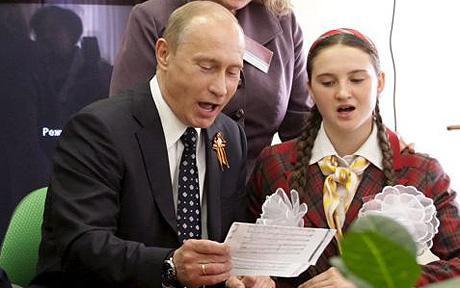 女學生卡特亞-卡扎科娃在演唱二戰著名歌曲《防空洞》時卡殼,普京隨即唱道:“火在狹促的爐中微弱地燃燒,柴火上的樹脂就像是眼淚。在防空洞里,手風琴在歌唱,為你的微笑和你的眼睛。”