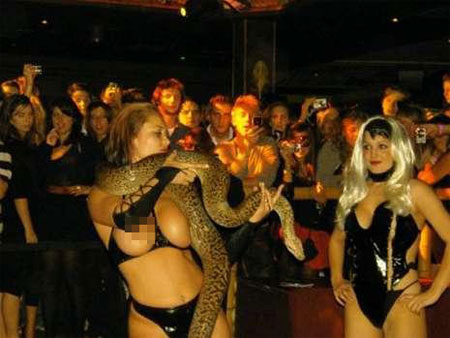 兩名身上涂滿油的表演者裸著上身摔跤,其他人的打扮也很性感,她們穿著用天然乳膠制成的服裝。晚會(huì)的重頭戲是裸著上半身的女郎表演舞巨蟒,一只長四米的巨蟒爬過女郎赤裸的胸部和肩部。
