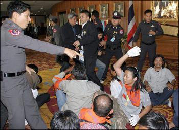據新加坡《聯合早報》報道,由前參議員宗黃帕功帶領的1500名工會分子、學生和政治活躍人士闖入國會大廈,其中百約人趁保安人員沒留意,溜進大廈直闖會議廳,導致開會的議員不得不休會。示威者說,隨著大選即將在兩周后(23日)舉行,現任國會已經無權立法。