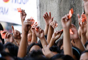 4月18日,菲律賓馬尼拉,大批貧民手持對(duì)換劵擁擠在一起,等候領(lǐng)取裝有大米和罐頭的禮物包。這是菲律賓前總統(tǒng)埃斯特拉達(dá)為慶祝自己71歲生日,而特意向窮人施舍的。