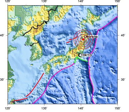 另據美國地質勘探局表示,地震震中位于仙臺市以北約100公里的秋田境內離地面10公里處;在震中南面390公里的首都東京也有震感,樓宇搖晃。據共同社報道,區內所有新干線服務自動停運,仙臺市地鐵也全線停運,宮城縣內的高速公路全部被封鎖。