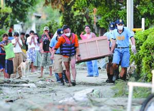 24日,菲律賓中部島嶼警方抬著“群星公主”號遇難乘客的棺材。連日來,不斷有遇難乘客的遺體被海水沖上附近島嶼海灘。