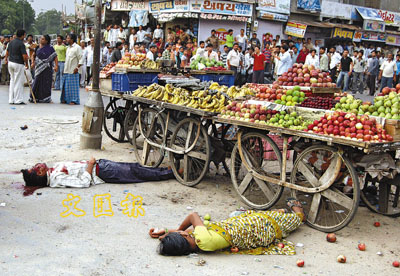 艾哈邁達巴德市的市集上,兩名遇襲者倒臥在水果檔旁。