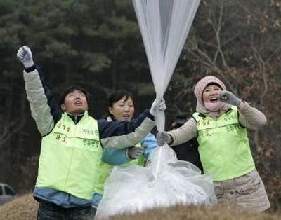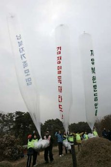 10名韓國(guó)活躍人士周四(20日)放出10個(gè)氦氣球,每個(gè)氣球掛了1萬(wàn)張批評(píng)金正日的傳單。