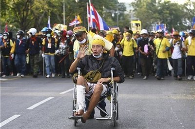 泰國反政府的人民民主聯盟抗議,24日轉戰曼谷舊的廊曼機場,出現沖突場面,警察被推倒,還有人動手又動腳,所幸其它警察趕緊將這位落難的同事拉了出來,而抗議領袖也要求大家冷靜守秩序。
