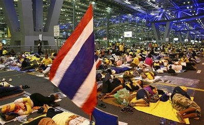 據悉,約2000名示威者闖入新國際機場客運大樓的離境大堂,泰國機場公司宣布在當地時間25日晚上9時起暫時關閉機場,準備在機場降落的航機要轉飛清邁、布吉和其它地區的機場,數以千計旅客滯留。