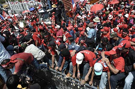警方說,約二萬名身穿深紅色T恤的示威者聚集在政府大樓外面。有人企圖推翻一輛警車,接著一批手持鐵錘和鋼絲鉗的人剪爛了用來封鎖大樓前公路的刀片刺網。