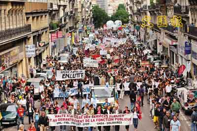 中新網5月16日電 法國公務員15日大罷工,抗議政府裁減公務員職位,全國有約100多場示威,上街公務員以教師為主,但亦包括醫院員工、海關人員、稅務官員、文化界員工等。這已是總統薩科齊去年上臺以來第3次大規模公務員罷工,使其公務員體制改革再受挑戰。另外,工會已準備下周四舉行更大型的罷工,會涉及更多行業。