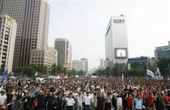 面對各方壓力,韓國政府已宣布推遲執行開放牛肉協議;李明博的7名高檔秘書亦于上周五集體提交辭呈,以表示承擔責任,但仍未能平息風波,反對派昨晚發起全國100萬人大示威,其中70萬人走上首爾街頭,但警方指示威者只有8萬人,而當地傳媒估計有20萬至40萬人。當局調動3.7萬名防暴警察戒備,其中2萬人部署在首爾。