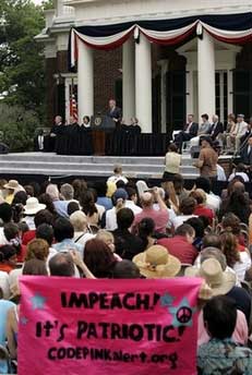據(jù)香港《文匯報(bào)》等媒體報(bào)道,布什在第3任總統(tǒng)兼《獨(dú)立宣言》起草人杰斐遜在弗州夏洛茨維爾的故居發(fā)表為時(shí)僅有10分鐘的演說(shuō),期間至少9名示威者被押送離開(kāi)。有示威者呼喊“彈劾布什!”又有示威者罵他“戰(zhàn)犯”。