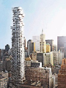 中新網(wǎng)9月15日電 為北京奧運(yùn)會“鳥巢”體育館進(jìn)行設(shè)計(jì)工作、受到各方贊嘆的兩位瑞士建筑設(shè)計(jì)師赫爾佐格(Jacques Herzog)和德默隆(Pierre de Meuron),將會把他們的創(chuàng)意帶到紐約。他們參與在紐約市內(nèi)興建一座透明玻璃摩天大樓。當(dāng)這座建筑物在后年建成后,驟眼看好像一層層單位半浮懸在空中,令人類幻想中的“空中樓閣”活現(xiàn)眼前。