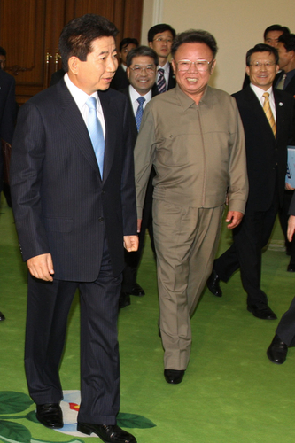 資料圖:去年10月3日,韓國總統盧武鉉與朝鮮國防委員長金正日舉行首次首腦會談時,就金正日前一天親自出來迎接表達謝意,而金正日對此以“我又不是患者”來回應,再次表現出其幽默的一面。